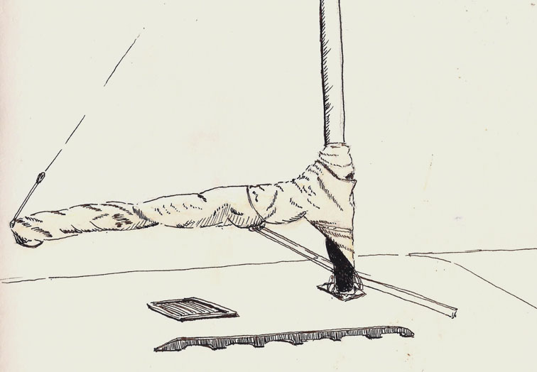 Sometimes I’m attracted by a shape, sometimes a texture. Unlike a lot of artists, I’m not driven to find “great scenes” but rather I like things that look like they’d be fun to draw. I think this sketch illustrates this point. I was walking along the harbor and found the sacks that cover furled sails create an interesting draped fabric shape and I thought they’d be fun to draw one… and so I did. Ain’t sketching fun?