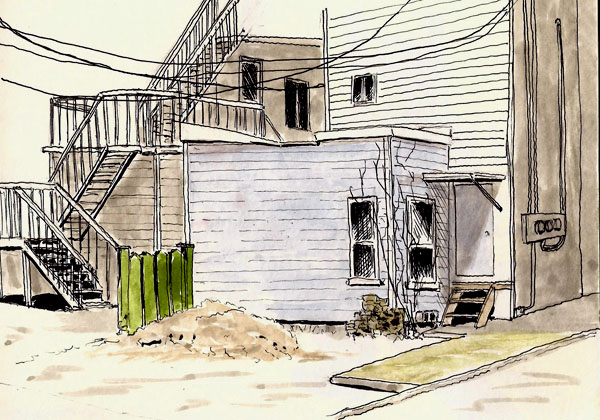 We’ve finally gotten a couple days where we could sketch outdoors and we’ve taken advantage of it. A group of us met to wander the alleyways and do some sketching together and we had a lot of fun doing just that. What alleyways may lack in terms of esthetics, they more than make up for in the form of interesting shape complexes and textures. If only there were fewer stairs to draw (grin).