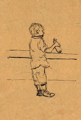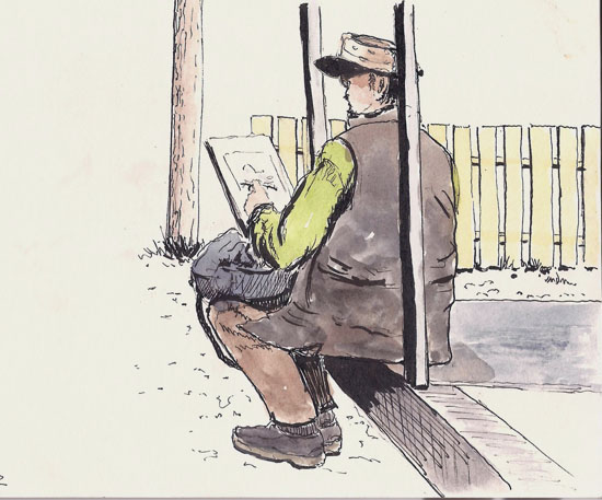 But I saw Hubert sketching and I related to his scrunched down form, head poking out from between the turned-up collars of his vest. It just seemed tell the story of my day and I had to quickly sketch him as well.