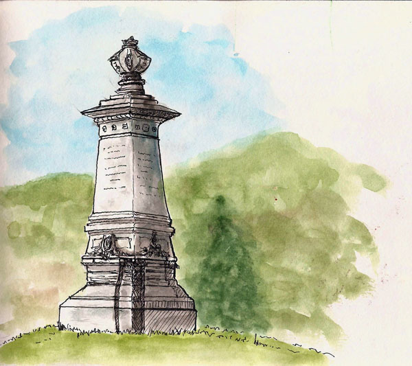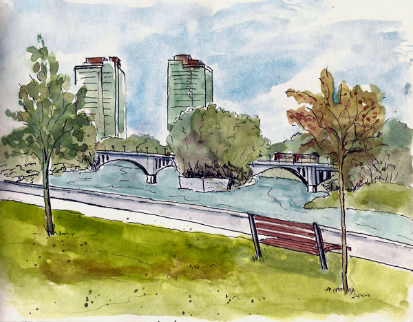 We arrived on Friday and our daughter was still at school so we got some lunch, went to an art store (more of a crafts store as so many have become) and then headed to one of the parks. As we walked around I saw this scene and decided that I’d do a very quick, thumbnail-style sketch just to capture the major masses. I didn’t worry much about proper perspective or drawing accurate lines and the initial sketch took only a few minutes. Then my daughter called and said she would be there shortly so we stayed put. I decided to add some more lines to the drawing and, ultimately, I slopped some color on the sketch.