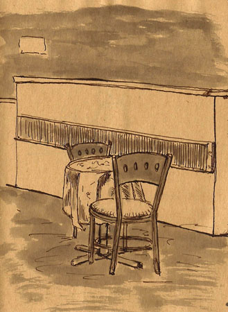 The next morning, however, was laundry day. We gathered up ever stitch of clothing, bedding, and towels and hauled them to a laundromat where we commenced to feed an obscene number of dollar coins into the machines. We drank coffee, ate muffins, and I drew this little scene in the tiny coffee shop associated with the laundromat. Not much but it was fun to do and made the time pass more quickly.