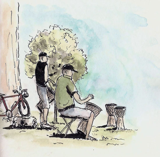 As it got hotter, though, the desire for shade took hold and we ended up in a park along the Rideau River. Another place to practice my sloth, I was getting quite good at it, particularly because there were a group of guys in a drum circle providing entertainment. I did break out the sketchbook to do this quick capture of a few of the players. It’s not very detailed but it’s the best I can do in a few minutes.