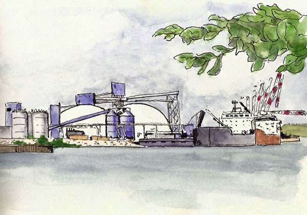 I was out walking and took the opportunity to sketch a bit of Quebec City’s port area. This is small portion of it, which is the place where Riviere St. Charles empties into the St. Lawrence River. It’s an ever-changing scene as large ships dock on each side of it for loading and unloading. It’s good to be out in the sunshine again.