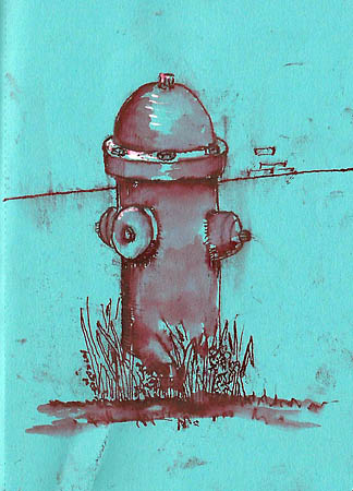 I was more doubtful about the other two colors but, again, Tina led the way. This morning I decided I should try the blue book so I could post a result in this blog post. I decided a fire hydrant might be nice and as I’d just filled a Pilot Metropolitan with Nooder’s Red-Black I started drawing. Not good…really bad, in fact. Noodlers Red-Black is supposed to be “water-resistant.” It is not… not even a little bit. I touched the drawing with a small brush with the idea of pulling a bit of shading from the lines and those lines just exploded. Thank goodness I was drawing a red thing because I was in chase my tail mode trying to clean up the mess. I wasn’t very successful and smarter people would probably not post this sketch. Here it is. Not the fault of the Field Notes but it’s a great example why I don’t use Noodler’s “water-resistant” inks.