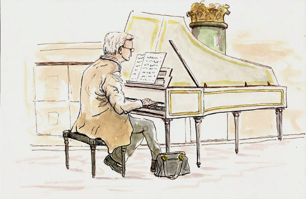 And so for me, it’s more about particular instruments. I love cello music of all kinds. I think classical guitar is sublime. But give me Bach played on a harpsichord and I am enthralled. So it was exciting for me to show up at the chapel for draw-the-carving session to find a guy practicing harpsichord. What could be better than listening to harpsichord music while sketching? Maybe sketching a harpsichordist while listening to harpsichord music and that’s just what I did. Unfortunately, when I finished I had to run off to the Musee de la Civilisation where there would be dancers to sketch. More on that tomorrow.