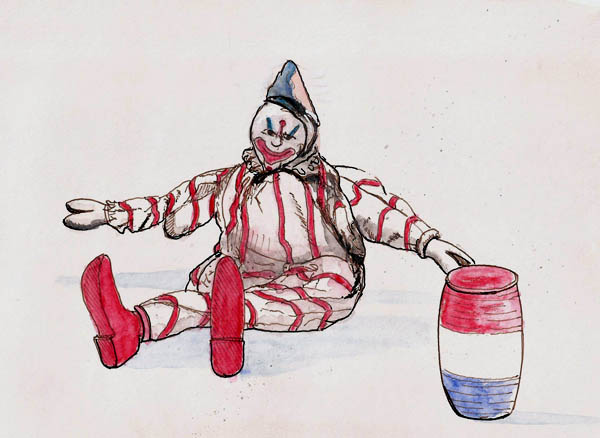 I found this little, three-inch high clown sitting in the bottom of a small display of early children’s toys. His right foot was missing but I made one up. He was lots of fun to draw.
