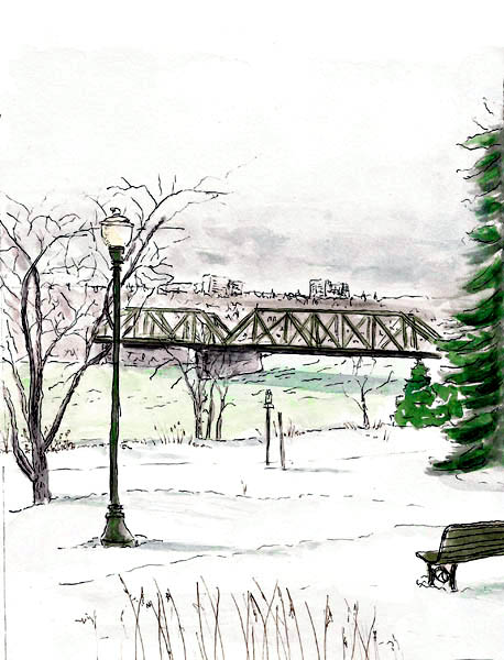Shari Blaukopf is a master at painting snow. I am not. Whenever I try I feel like I’m sketching a polar bear on a glacier. Everything is white. Yesterday I tried again, working from a photo I took from the window of the Maison Dorion-Coulombe, the site of our recent sketchcrawl. I always feel that my sketching from photos reflects too much my disinterest in sketching from photos but still, I should be able to do better. I thought I’d share the results with you anyways. Maybe I’ll get better at snow…some day.