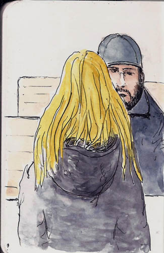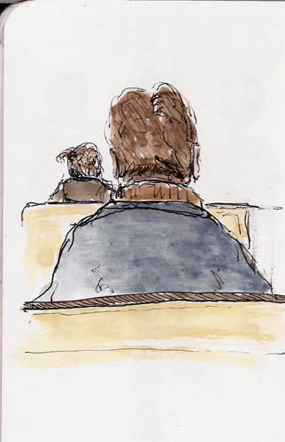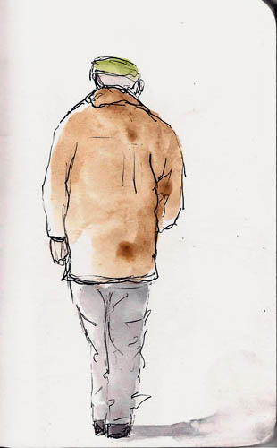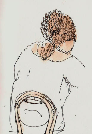 There’s not much to tell about the session. I got a cup of coffee and started drawing. I was using my Platinum 3776 with Platinum Carbon Black ink and I was sketching in a Stillman & Birn 4×6 softcover Alpha series book. Great combination for this sort of thing as I like to add a bit of color when I finish up and the S&B paper accommodates that nicely. I did time the session as I wanted to see how long I could keep doing it without getting tired. I’m a lazy sketcher and have to push myself to sketch for long periods of time. Come to think of it, long periods of time is a very relative term and, for me, “long periods of time” means relatively short. Quick sketching is rather intense as people are moving a lot, but I managed to draw for 45 minutes, punctuated by coffee drinking. I ended up with 14 sketches. Here’s some of them. I got tired of scanning. I told you I am a lazy sketcher (grin).