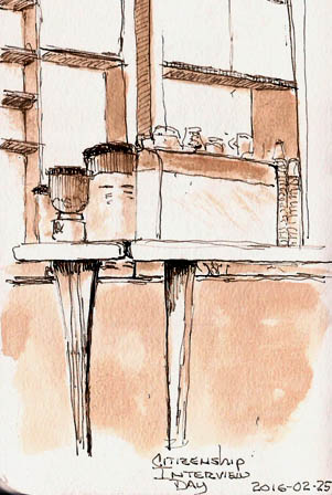 Because I was traveling light, I had only the pen (Pilot Prera), a waterbrush with dilute brown ink, and small sketchbook I carry in my coat pocket. I got it out and started a quick sketch of the barista area of the coffee shop. I had less than 10 minutes before my interview which was on the 2nd floor of the building next door, and I had to drink my coffee too. Nevertheless, I did this small sketch of the area.