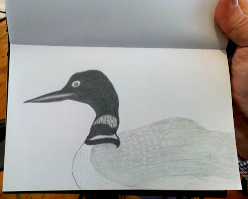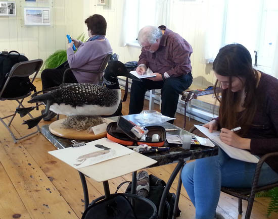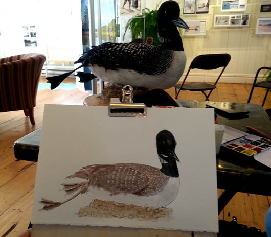Popular subjects were the Great Horned Owl and the Northern Loon but some ink was spilled documenting the river otter as well. I did a quick drawing of Cassandra at her desk. There was more chatter than normal between the sketchers, probably because we were so tightly clustered but that was fun. Generally we have to wait until lunch to talk.