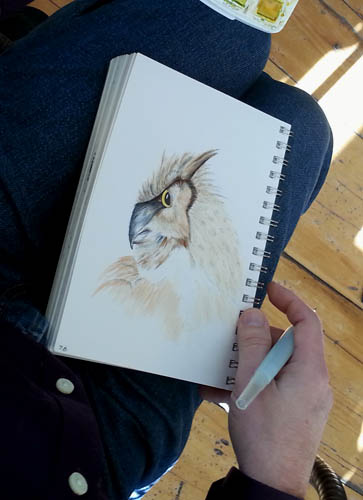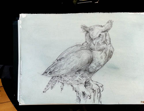 Celine, Yvan, and Rene drawing the Great Horned Owl