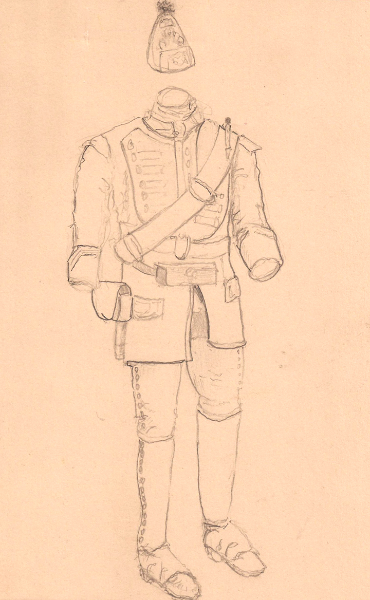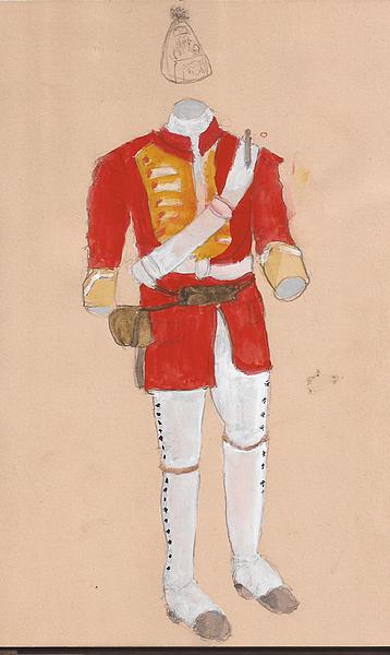 Oh…before I go. As if I haven’t embarrassed myself enough with these sketches, here’s an example of where artistic accidents aren’t so happy. I decided to add some color to my uniformed manikin and while doing so dropped a brush full of pyrrol red onto the left side of the uniform. I scrambled to fix/fake it but gave up after a while.