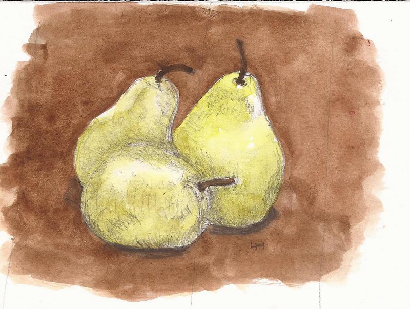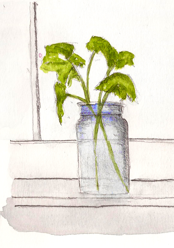 I drew these pears, first as a pencil drawing but later with some color added. Then I spied a Ball jar in the window that had something growing from it. It was too far away to tell what it was (later found to be geranium starts) but I started sketching it anyway. I find it both hard and easy to draw things I can’t really see. Hard because it’s difficult to make out the objects being drawn but easy because it’s easy not to be distracted by details when you can’t see them (grin).