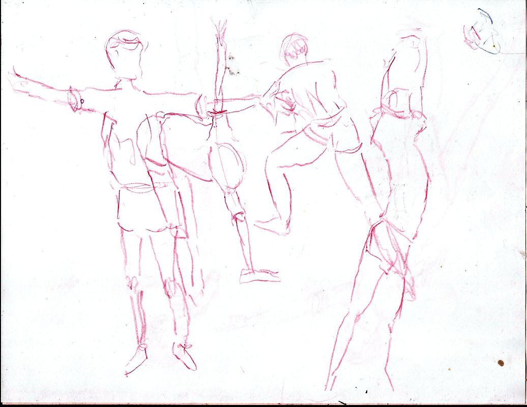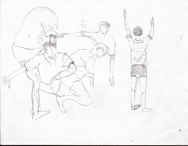 Anyway, here’s three of the pages I did. Note that I have no “technique.” I drew on photocopy paper and drew on top of previous poses. That’s something I will do differently if I ever get another chance as it sometimes became confusing. I worked with a colored pencil and then a plain old 0.7mm mechanical pencil. Very basic.