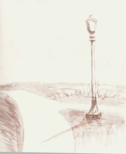 I stopped at a park bench and decided to try to draw/paint directly with a brush. I’ve been learning how to handle brushes and Marc Holmes’ 30 in 30days (direct to watercolor) event is coming up next month and I want to try it. I didn’t bring my watercolors but I had a waterbrush with some diluted ink and so I did this simple drawing. Look ma, no lines. I include it here only for the sake of completeness.