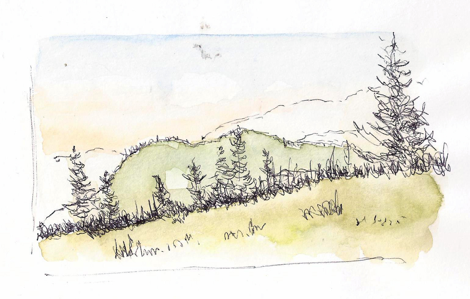 But I did want to sketch and so I sat up, noticed a line of trees and started sketching. The “scene” wasn’t that great so I added my own mountains and came up with this sketch.