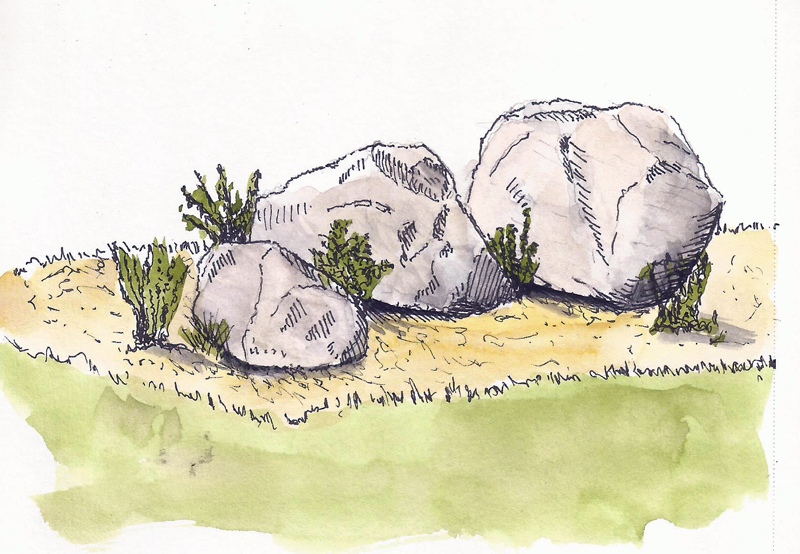 It was time to walk so I headed up river and eventually came across some rocks to sketch. These sit, among others, at the end of a new walk bridge the city built last year. I’ll have to sketch that soon but for this day these rocks were just the thing. Color got added when I got home.