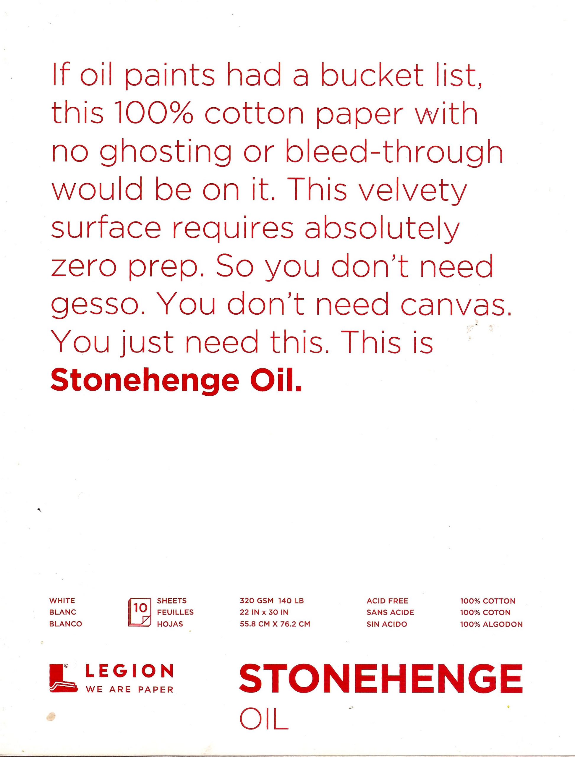 It’s sold in standard 20×30 sheets and, rumor has it, will also be available in smaller sizes either as pads or sheets. Anyways, Legion was nice enough to send me a couple 28×21.5cm sample sheets so I could experiment with it as an oil paint sketching medium. I’ll report back “real soon” as it looks like an ideal surface for draw->paint work.