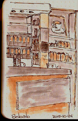 I sat down and, still in pleasant price shock, I scribbled out this little sketch of part of the counter area. The coffee was good. It was cheap, and a steady stream of people seemed to know all about it. As I enjoyed my coffee I did some quick sketches of people ordering their own inexpensive coffee.