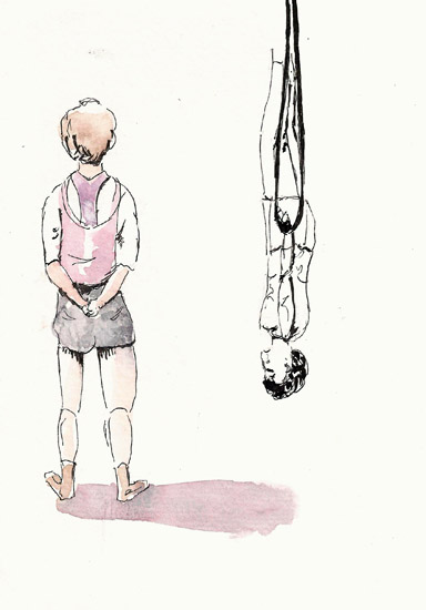 This woman made it a bit easier on me as she was working with a coach. Her thing was to have two sets of belts hanging from the ceiling, as a gymnast working on rings might do, except she had no rings, just the loops of the belts. She was practicing hanging vertical and moving her legs into and out of different positions. She’d also dismount once in a while and stand, talking to her coach. It seemed more like the popcorn in a bowl rather than in the popper and I took advantage of it. I also drew a bunch of people who were just sitting/standing around but I’ll spare you those.
