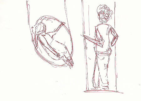 The woman on the left was spinning around and around in this hula-hoop thingie hung from the ceiling. She’d hang from it, zip up through it and sometimes dangle with hands outstretched in different directions. By the time I had a line or two “defining” the woman on the right, she was upside down and she too was swinging, hanging and moving… a lot.