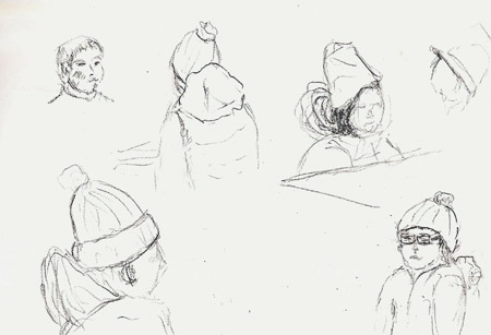 While we were eating lunch, a bunch of kids came into the room to eat lunch. They were all bundled up in coats so I took the opportunity to do some quick pencil sketches of them. It was a fitting end to the day as eventually I put my coat on too. It’s that time of the year where I always lament that I’m now having to put on a coat before I go outside (grin).