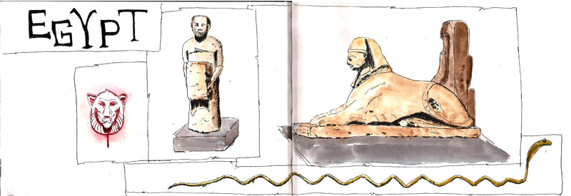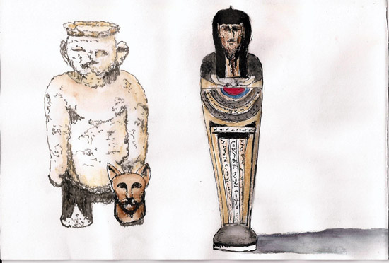 But, truth be told, outdoor sketching is mostly over so I’m making regular trips to the museum to draw. The big exhibit right now is Egyptian and composed, mostly, of small statues, jewelry, and some miscellaneous goods. I’m in a mood right now to work on speeding up my sketching so rather than doing slow, precise drawing of these items, I’ve decided to draw a bunch of them more quickly. I’m not quick-sketching (2 min or less) but rather I’m spending 10-20 minutes per item, trying to capture them as accurately as I can in that time. Given my normal snail-like pace, I admit to feeling rushed. It’s fun and I’m hoping that this exercise will add something to my skill set. Here are a couple of the sketches I did during the first exercise session.