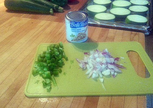 Step 1: Slice some 1/2″ segments of zucchini and lay them on an aluminum foil-covered baking sheet. If I think about it, adding a bit of oil to the foil is probably a good thing but I generally forget and it’s not a problem.
