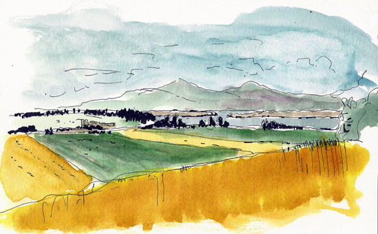 We picked up Louise at her house and headed to a side road overlooking the valley and its agricultural fields. Everyone set up next to a wheat field with the expanse of the valley behind it, but I walked down the road to sketch an outbuilding I’d seen as we arrived.