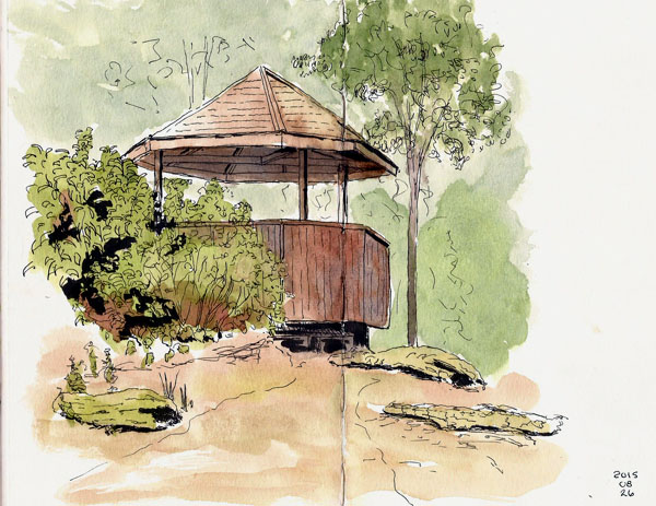 Off we went, to a small nature park not far from St. Vallier. It was a parking lot, picnic tables, some trails and a gazebo set up for bird watching along the coast. Most of us decided to draw the gazebo. Here’s mine.