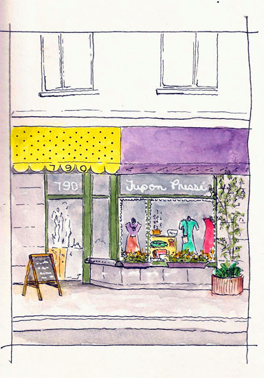 It has become a park, as the graves were all moved at some point, though many of the original gravestones remain, it’s where downtown people go to eat lunch and enjoy the trees and park benches. I was going to draw some of the old head stones, but as I rounded the end of the church I saw this store across the street from the church. I’m sure I’ve walked under those awnings a bunch of times but I’ve never noticed them. From the cemetery the store was hard to miss and I found the place really cute. So I drew it.