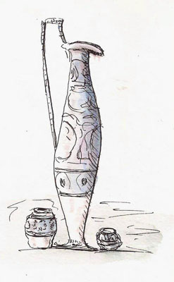 We continued walking, talking and generally wasting time until hunger took hold. We decided to head to one of my favorite spots for lunch, McDonalds. Not any old McDonalds as I’m not particularly fond of the food, but rather the McDonalds on St. Jean street, where you can sit in a window on the 2nd floor and look out at great scenes and down on lots of tourists. I’ve done a lot of sketches from this perch (their coffee ain’t bad). On this day, since I didn’t want to spend a lot of time ignoring my daughter, I did a simple sketch of the window contents across the street. The pitcher was tall and very striking. I doubt I did it justice in the few minutes I spent on it.