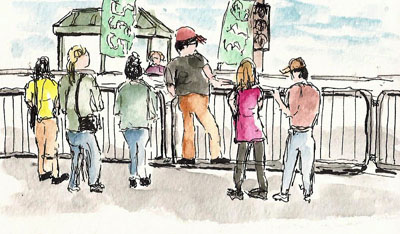 My daughter was supposed to meet someone downtown in the afternoon and so eventually we split up and I headed home. On my way I found that the Levis Marathon, an annual event, was finishing up. I decided to quickly sketch some of the spectators lined up along the receiving path the runners took to the finish line, along with the proverbial guy who feels the need to climb up on the fence to be above everyone else.