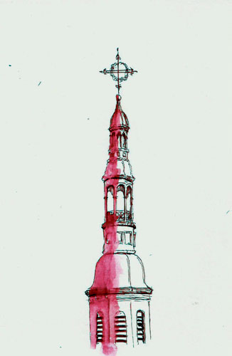 We only had 25 minutes left on our parking time (grrr…grumble), so we decided to do another sketch. I wandered around a bit while she sat down to draw. I decided on this scene and rushed it a bit to fit it into the time frame and think I might return with more time and bigger sketchbook. This was done in a 3×5 Moleskine watercolor book.