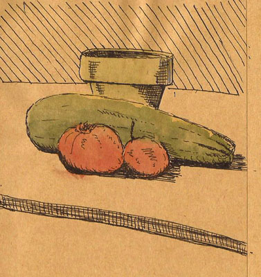 We’ve been having great summer evening weather lately so there’s been considerable porch sitting. On one of those occasions I grabbed some veggies and did this quick sketch. The “mustache book” paper doesn’t handle watercolors very well (it is afterall a 4×6 el cheapo [$2] book from the dollarstore) but such sketches are lots of fun and good practice. Goodness knows I need all the practice I can get.