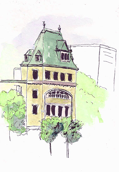 My daughter returned to school last week but before she did we spent one morning wandering around old Quebec City, enjoying an unseasonably warm day. We sat down near City Hall in the new fountain area south of the building and while we chatted, I did this quick sketch.