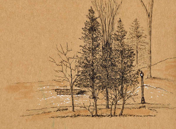 Yesterday was my first attempt to walk it and while I had to crunch along on top of icy snow, there were some places where the path was clear. The day was nice in any case and I stopped to sketch this cluster of trees on the other side of the river. It’s sooooooo… nice to be sketching outdoors.