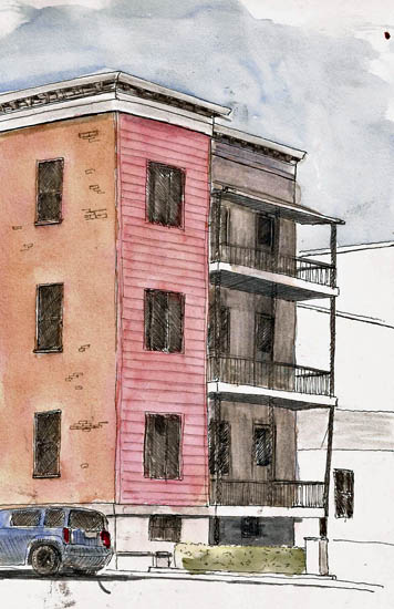 After I did this sketch I walked a bit, trying to warm up before plunking myself down in front of a building to give the ink another try.