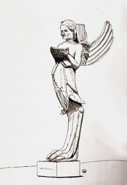 I view sketching of such things as practice with seeing relationships and proportions and this one was a definite challenge to my limited abilities. As it turns out, the big block sticking up from its back is actually a compromise to its function as this 2-foot high statue (carved from stone) was a table leg. Maybe there are three more just like it wandering around Greece.