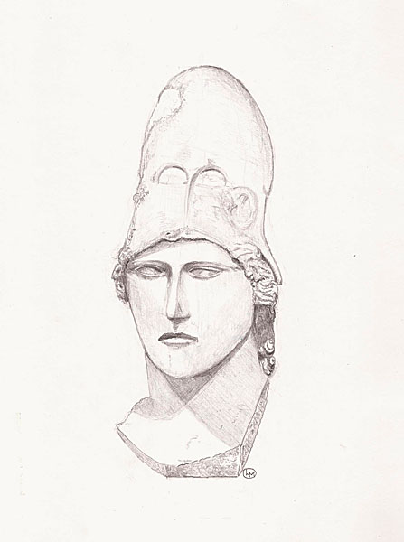 So, when I went to the museum yesterday I was determined to use a graphite pointy device to make a drawing. I decided to draw Athena, with her leather helmet pushed back on her head. She’s a reminder that strong women were very much a part of the Greek religion. The daughter of Zeus, Athena was the goddess of reason, intelligent activity, arts and literature.