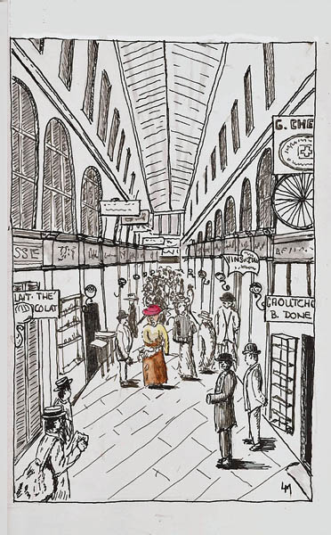 If you’ve been following this blog you know that I’m spending some of my winter sketching time at our museum and its Paris 1900 exhibit. This week I decided, without giving it sufficient thought, that I should sketch a huge black and white photo that’s projected on a wall. It must be 12-14 feet tall and shows an indoor shopping area that, I understand, still exists today.