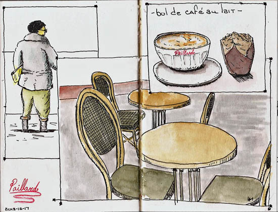 I’m rambling. Sorry. Claudette and I went to sketch Paillard the other day and we had a great time. I got my bol de café au lait and a muffin. She was less of a cochon (pig) and got a regular café au lait. We were there early and pretty much had the place to ourselves. There were a couple people sitting behind me and Claudette started sketching them. With no people in my sight line I drew food and chairs and tables. Ultimately I did quickly sketch a woman who was ordering something, maybe her own bol de café au lait . Here is my tribute to Paillard.