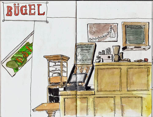 In my continuing quest to eat my way through Quebec City, sketching as I go, Claudette and I visited Bugel – Fabrique de Bagels, a small place that makes some of the best best bagels I’ve ever tasted. Situated at 164 rue Cremazie, it is hidden from the main traffic corridors but the locals know it well. Besides, there are a great used bookstore across the street that has a lot of art books I can’t afford, but looking is free.
