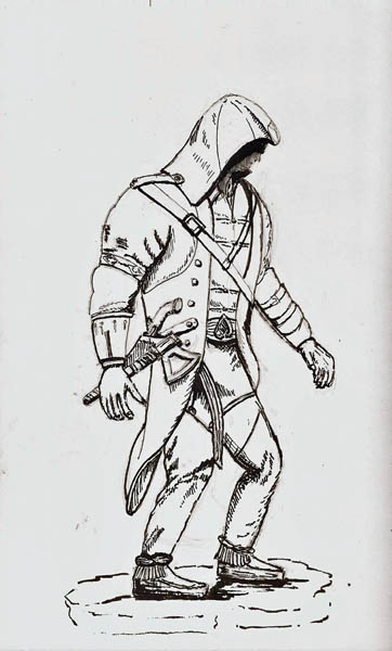 A couple days ago I posted a couple pen and ink graphics of some spiffy clothes with people in them. One of them was this guy, Connor, from the Assassin’s Creed game. My one disappointment was that his costume is blue, tan and brown and the local color is lost in a pen and ink sketch.