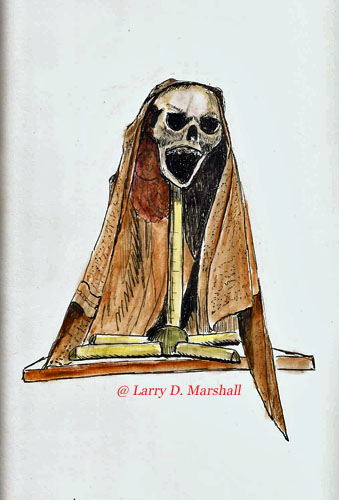 But I was sketching at the Musée last Sunday with Yvan, Claudette, Pierre and Celine. We had a ball and several of us sketched what amounted to a human skull, perched on the base from some sort of rack. The skull was draped with a shawl and fake hair added to one side. This ‘unit’ was stuck on top of a television set. Don’t ask me why or what as I might not say the right thing.