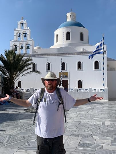 We returned the car at the airport and stayed at a miserable hotel at the airport before flying the next morning to Santorini. We stayed in Santorini four nights and five days. We cruised out at sunset and ate shrimp and swam in the Aegean, we cruised again to the volcano and climbed up the summit, swam, and ate at a very rustic fishing village, walked the seven mile hike around the rim, visited the Ancient Theran Museum which is amazing, swam at Red Beach, which takes a lot of dangerous pathfinding to get to. Santorini does not have good beaches. I am completely convinced, after visiting the island, that Santorini and the disappearance of the Theran people three and a half millennia ago is the root of the Atlantis myth.