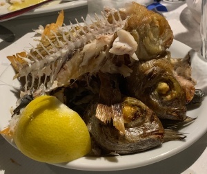 The leftover fish after our last dinner on SantoriniThe only thing that was not good was the coffee. They push a lot of Nescafe in Greece. A Greek Coffee, as best I can tell, is just about a half a cup of Nescafe and hot water, unstirred. In the afternoons they serve a caffe freddo, which is iced coffee with milk. Its not awful, but its not that good either.