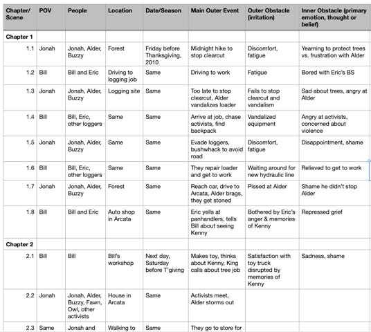 Together, we created a huge spreadsheet that, as Jim says, listed “every scene, its POV, the people in it, location, date, main outer event, the POV character’s outer obstacle, inner obstacle, the author’s intent, and other elements.” I had experimented with the SAC for other students, but Jim’s enthusiasm and obvious benefit from using the chart inspired me to really develop it.