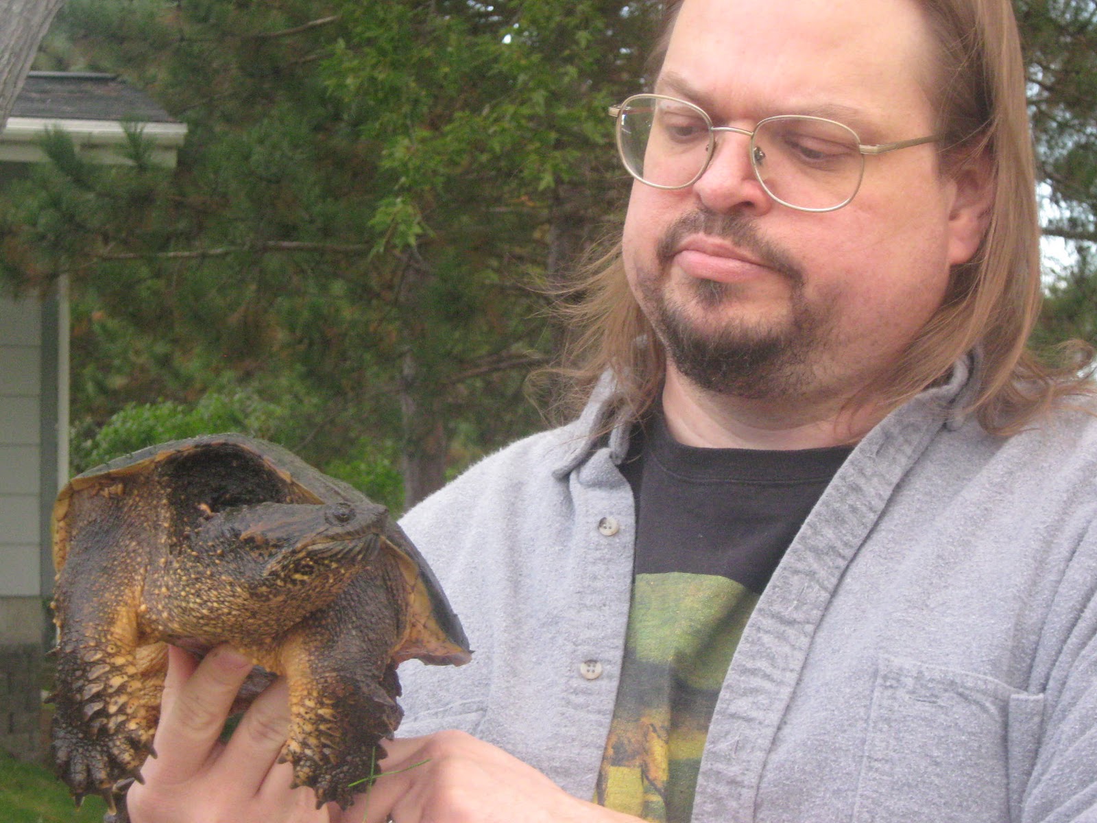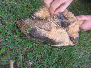 Jake and I probably deserve any bites we get while playing with snapping turtles, but unprovoked attacks happen occasionally. Some swimmers have lost toes to large snappers. The power of the bite is phenomenal. The video below shows a captive snapper feeding on rats. It's a good illustration of the animal's predatory technique: seize with the mouth, then decapitate or eviscerate with a quick stroke of the claws.