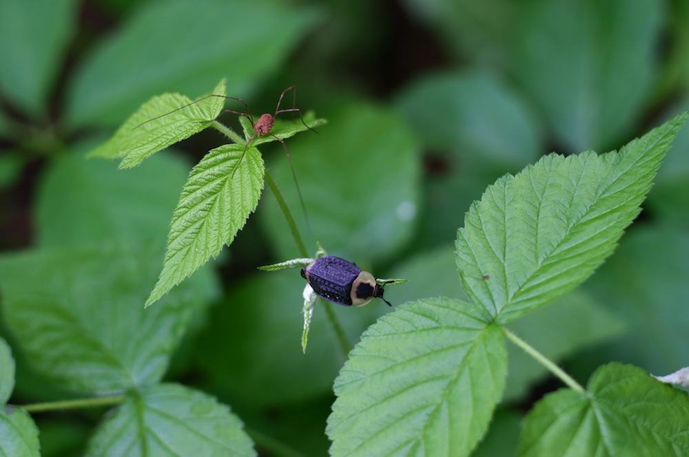 In the bottom picture, you can see what looks like the bud of a purple flower. It's actually a carrion beetle, a very cool critter in its own right.